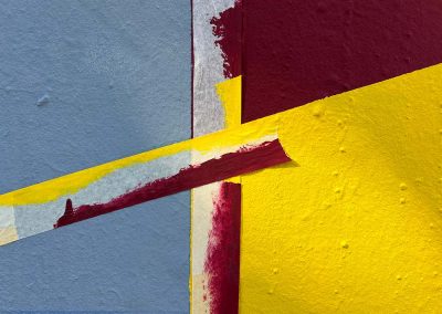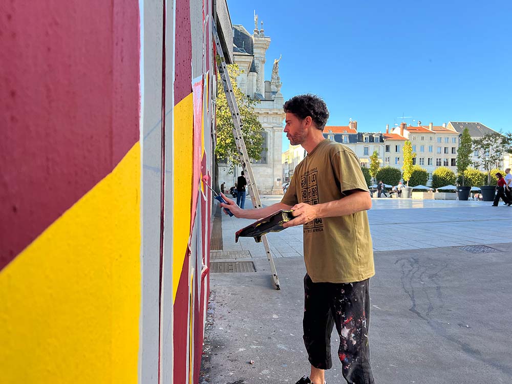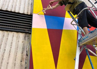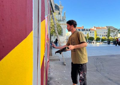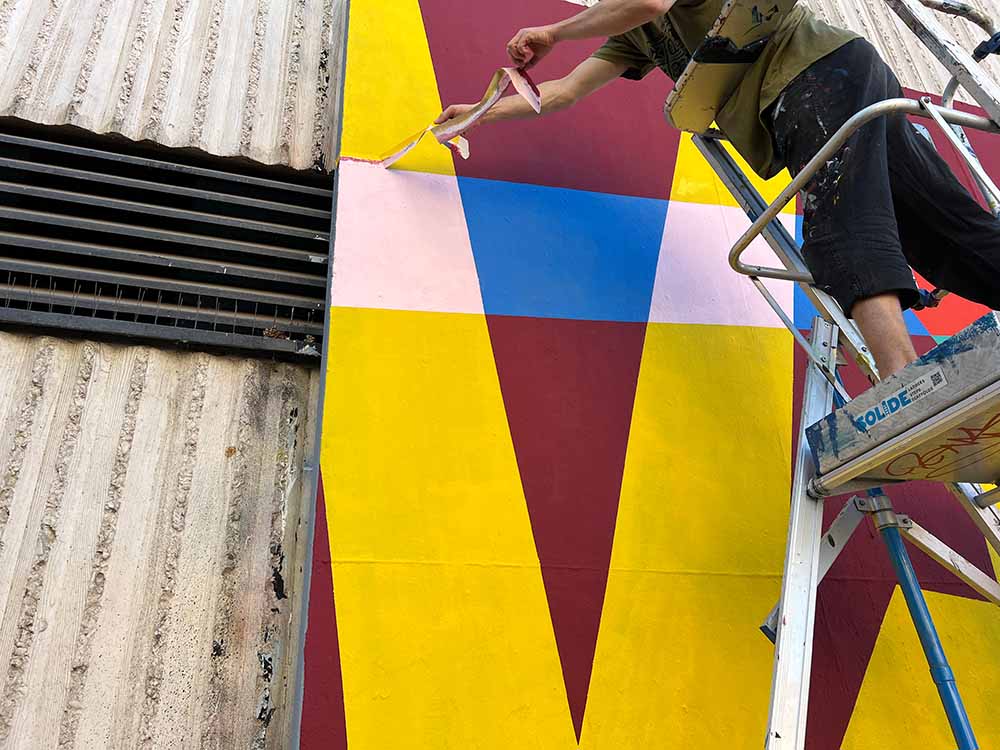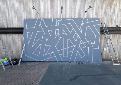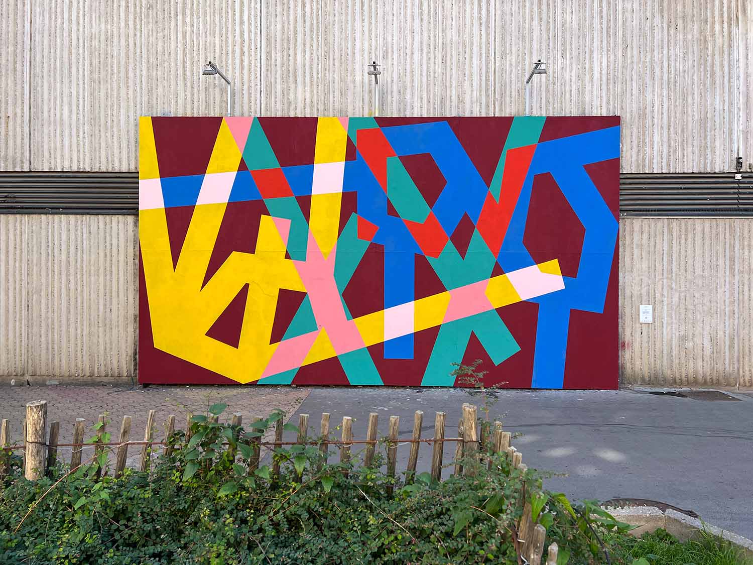 Wha-t développe une pratique visuelle située entre art urbain, graphisme et abstraction. Inspiré par les structures, volumes et rythmes de l’architecture, il crée des fresques murales à la fois énigmatiques et minimalistes. Jeux de lignes, ruptures et superpositions construisent un langage visuel singulier, souvent proche de l’alphabet. Son travail interagit finement avec l’espace, questionnant les codes et perceptions du paysage bâti.
