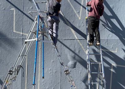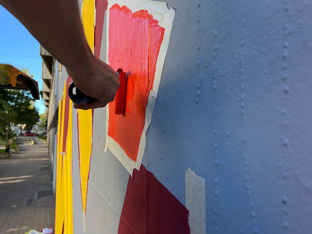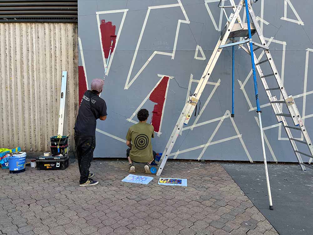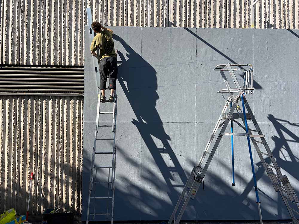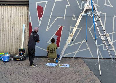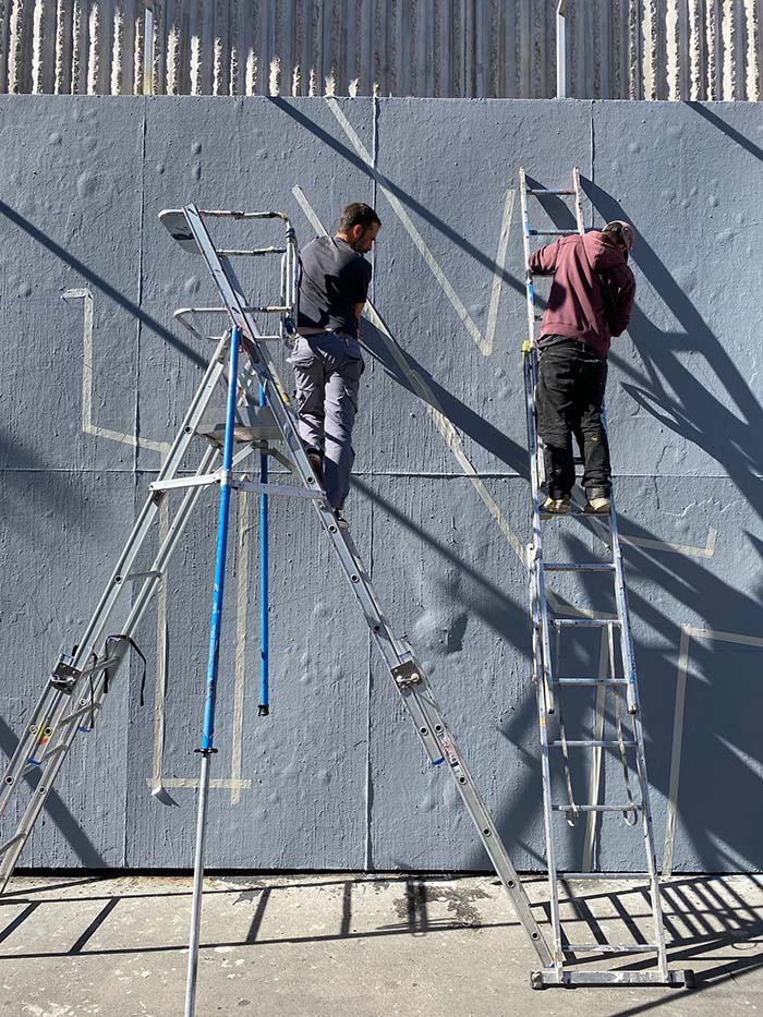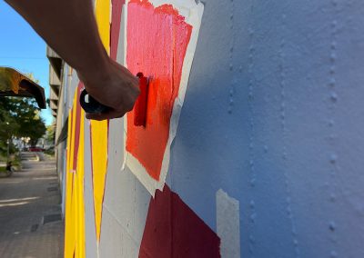 Wha-t développe une pratique visuelle située entre art urbain, graphisme et abstraction. Inspiré par les structures, volumes et rythmes de l’architecture, il crée des fresques murales à la fois énigmatiques et minimalistes. Jeux de lignes, ruptures et superpositions construisent un langage visuel singulier, souvent proche de l’alphabet. Son travail interagit finement avec l’espace, questionnant les codes et perceptions du paysage bâti.