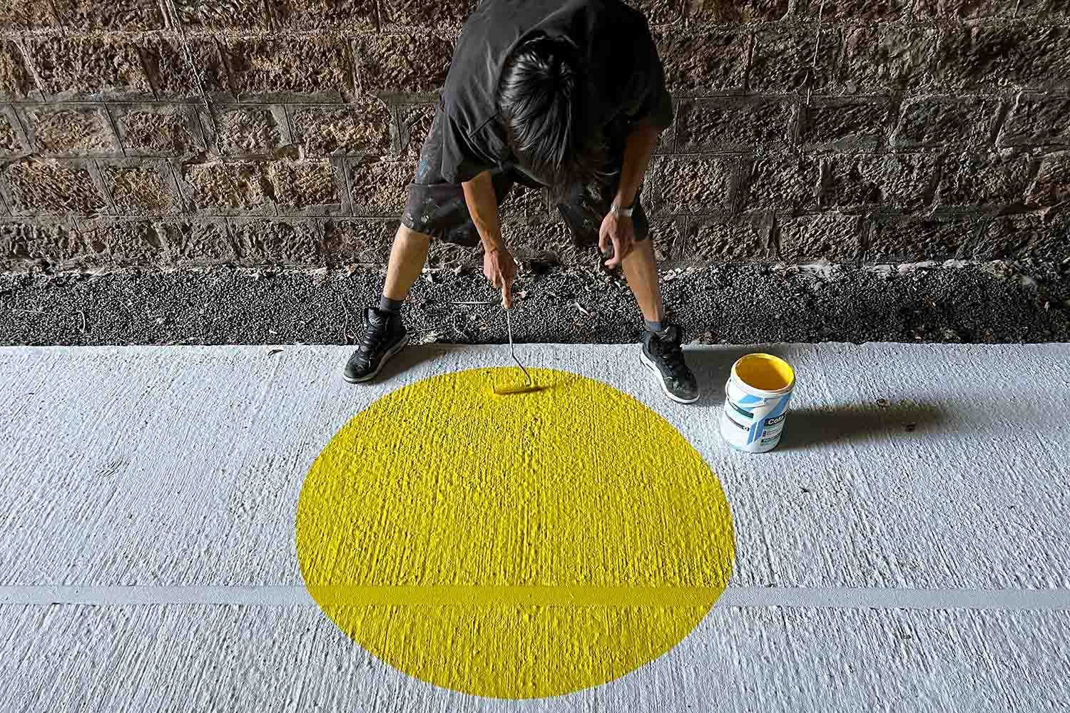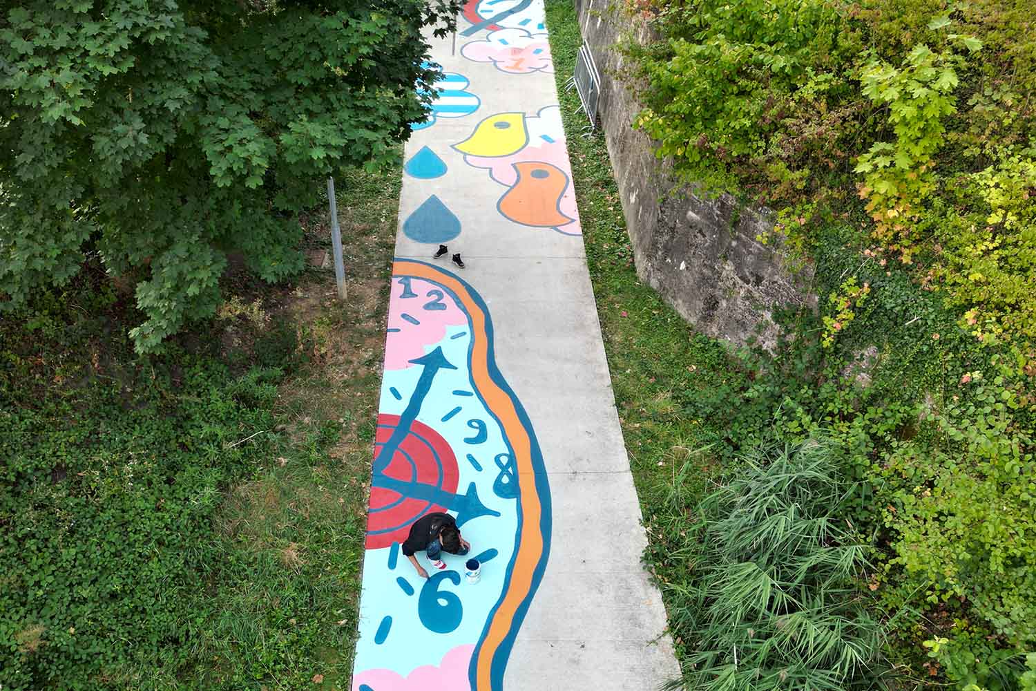 Pour cette peinture au sol l’artiste nancéien Joris Infanti a voulu jouer de cette géométrie en proposant des formes en courbes. Les couleurs contrastent avec l’aspect très gris du lieu. Pour ce qui est de l’univers, il a souhaité évoquer Lewis Carroll et s’appuyer sur la notion de temps.