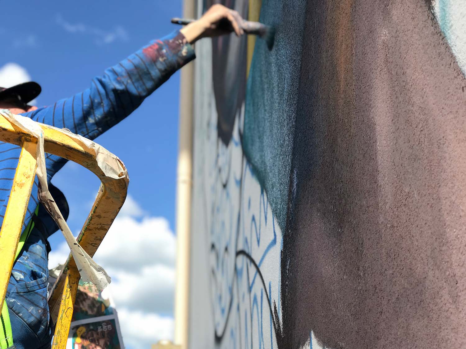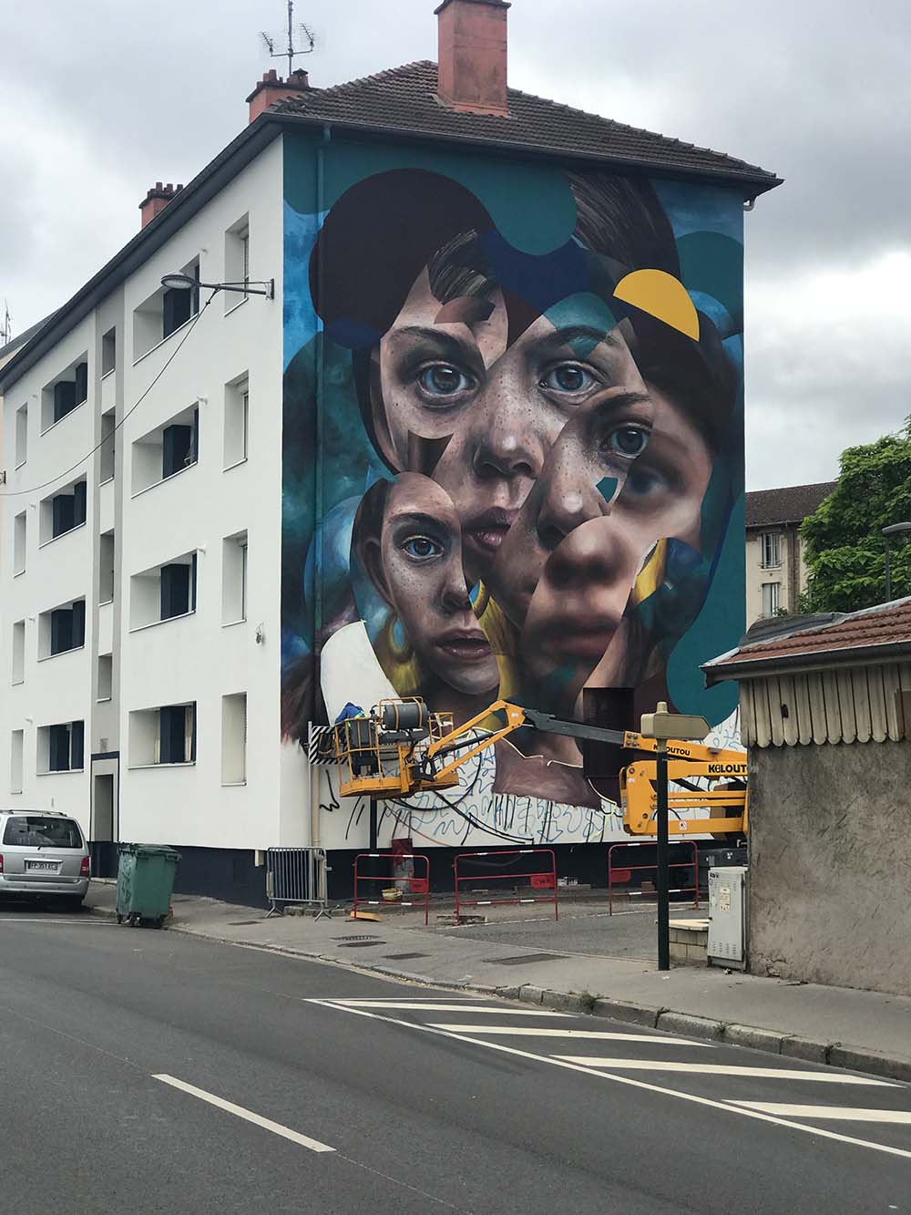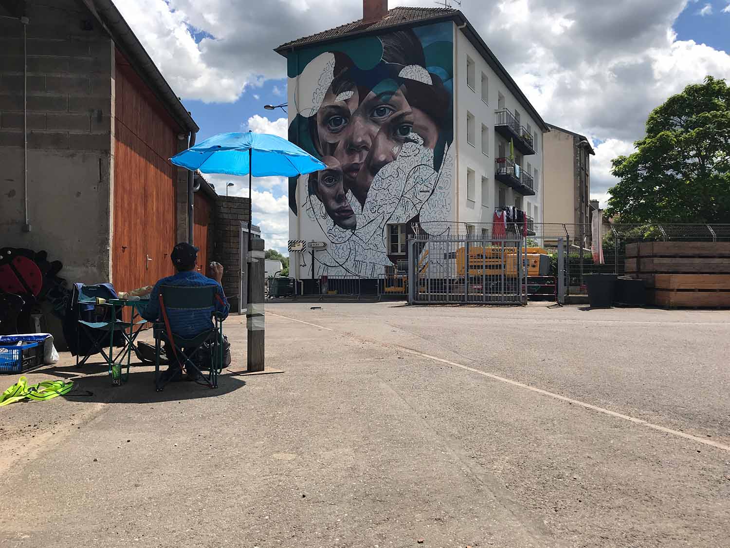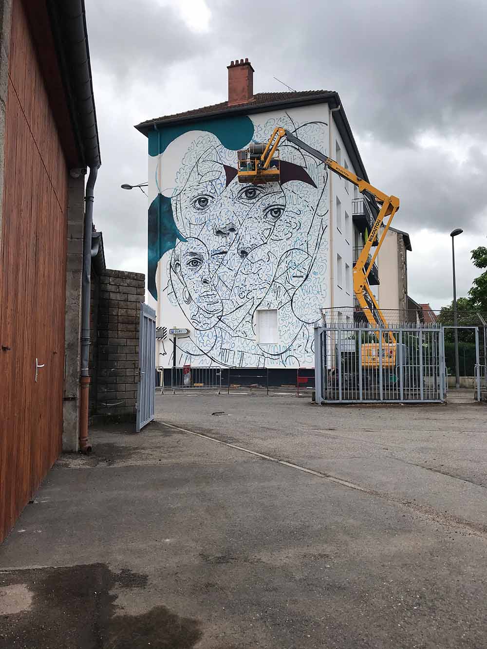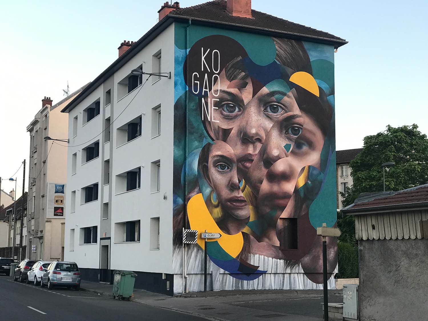 La peinture de Koga ayant été recouverte en raison d’une isolation par l’extérieur, nous avions à nouveau une façade vierge Boulevard Lobau à Nancy. Nous avons donc proposé une nouvelle œuvre par le même artiste, et l’idée a été validée. Nous avons pu voir l’évolution du travail de Kogaone dans son travail des couleurs, des compositions et des détails.