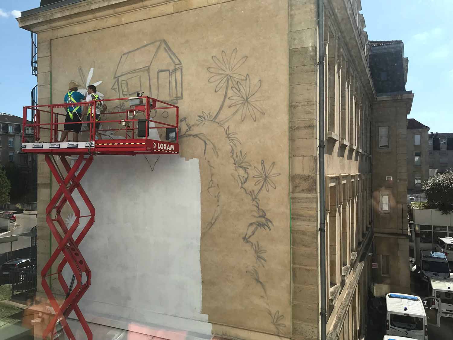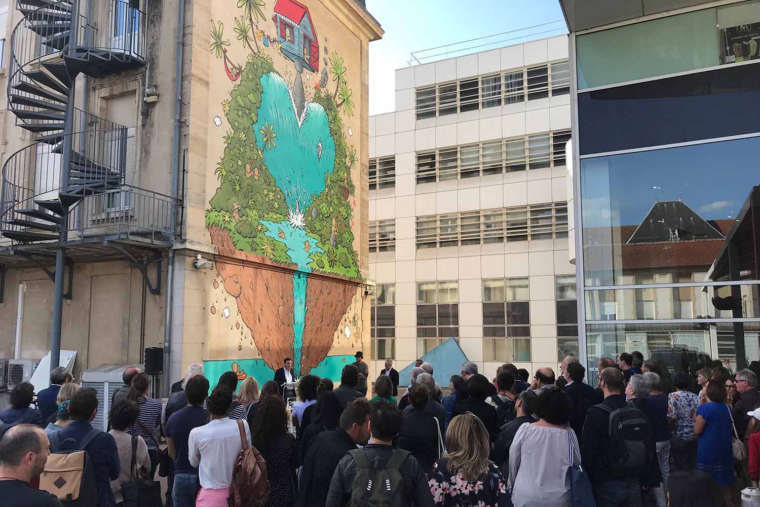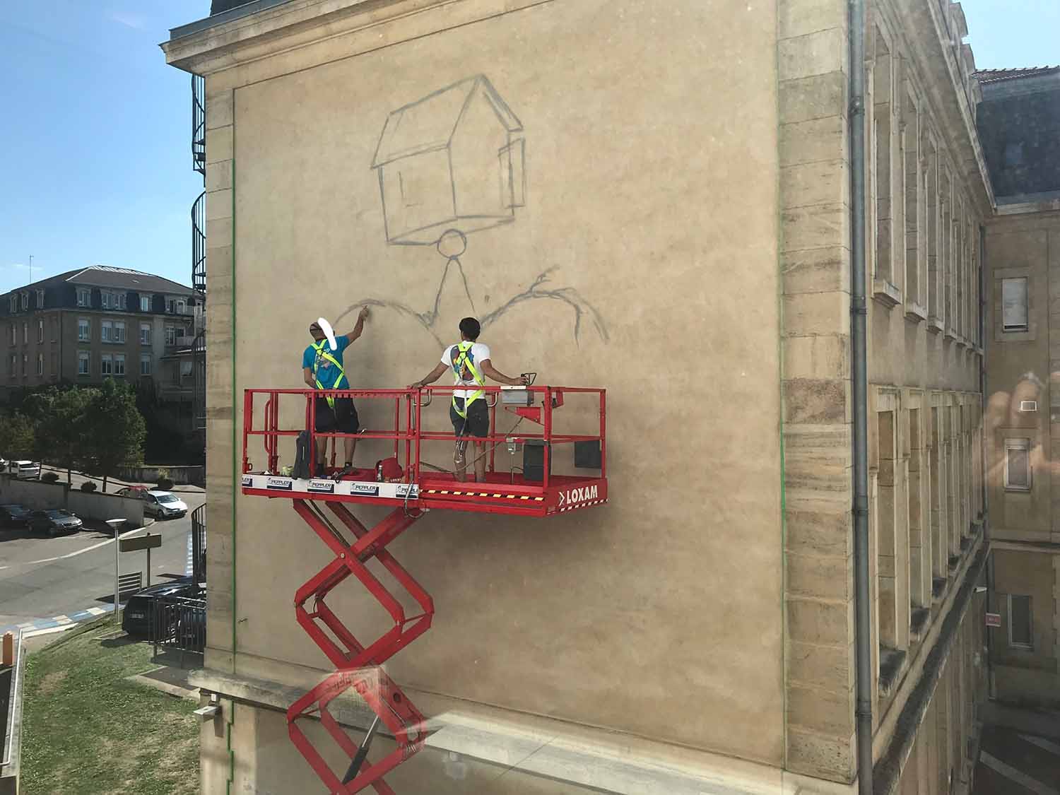 La direction du CHRU Nancy souhaitait une œuvre à message positif pour l’enceinte du CHRU Nancy. Notre choix s’est porté sur l’artiste Réunionnais Jace dont les Gouzous sont célèbres dans le monde entier. La commande consistait à réaliser une fresque sur un pignon, et à disperser quelques illustrations dans différents endroits, car contrairement à une idée reçue, le public peut librement se promener dans les parties extérieures et les couloirs principaux des hôpitaux.