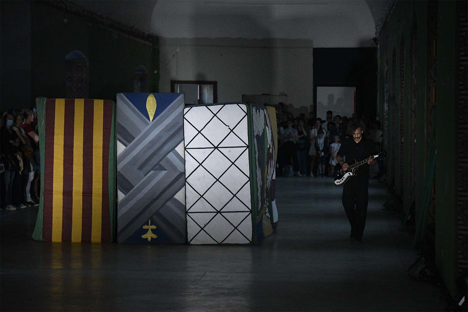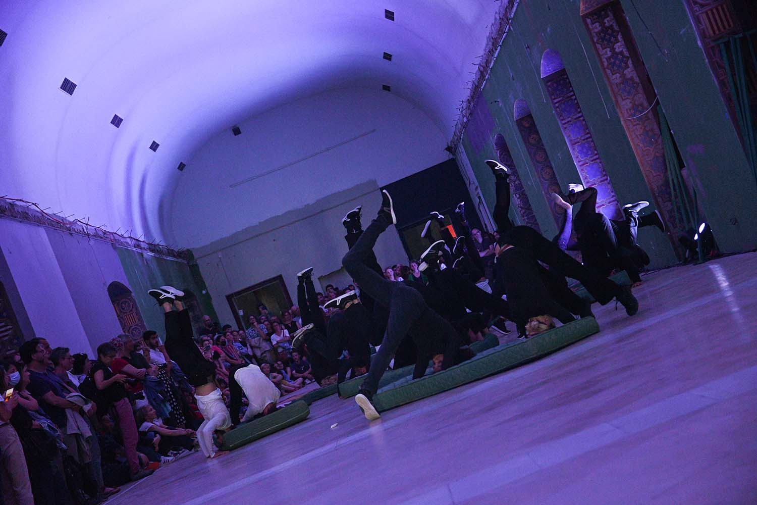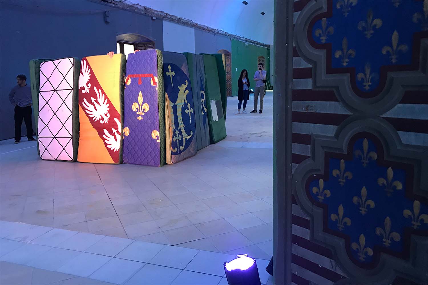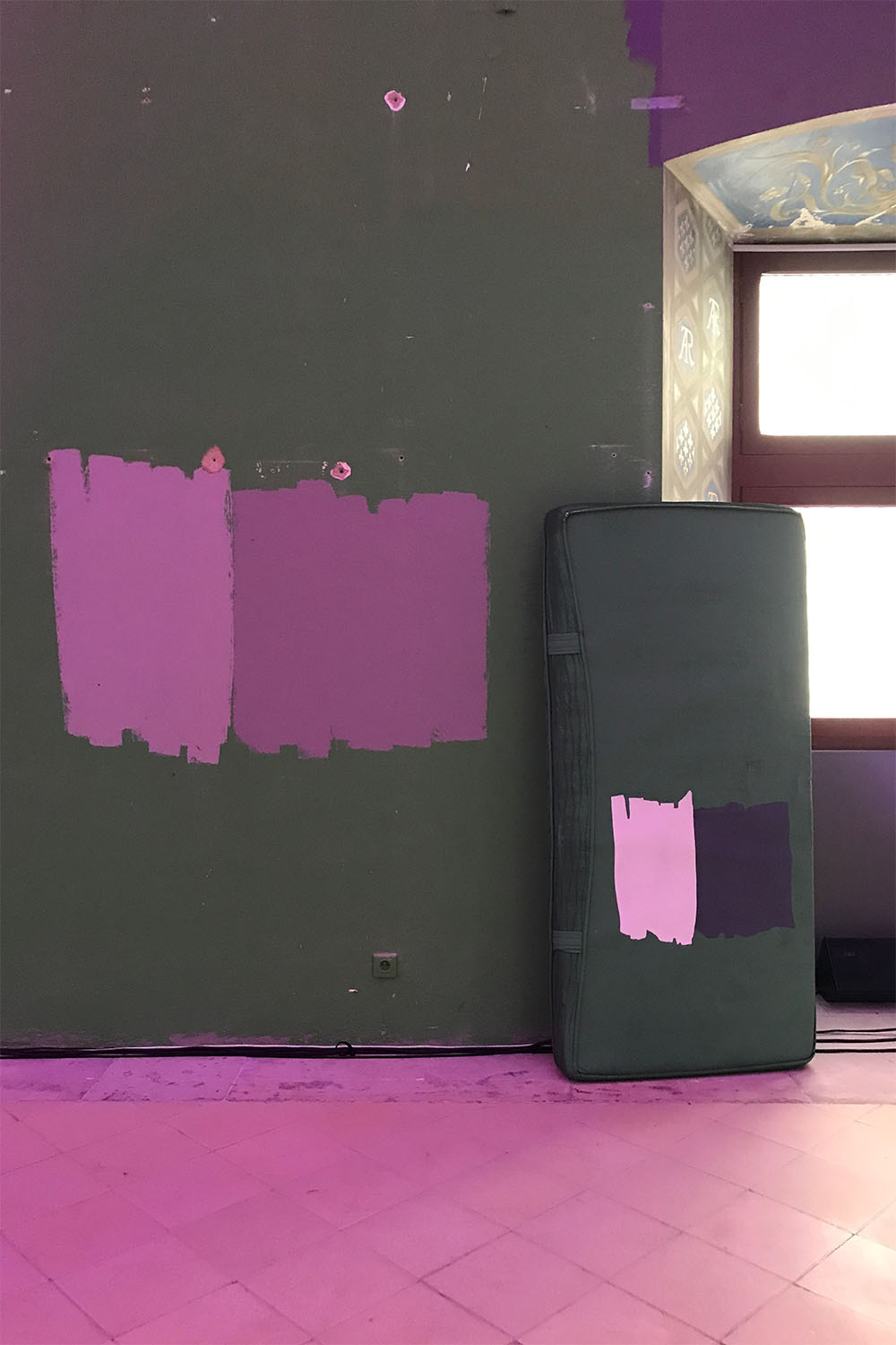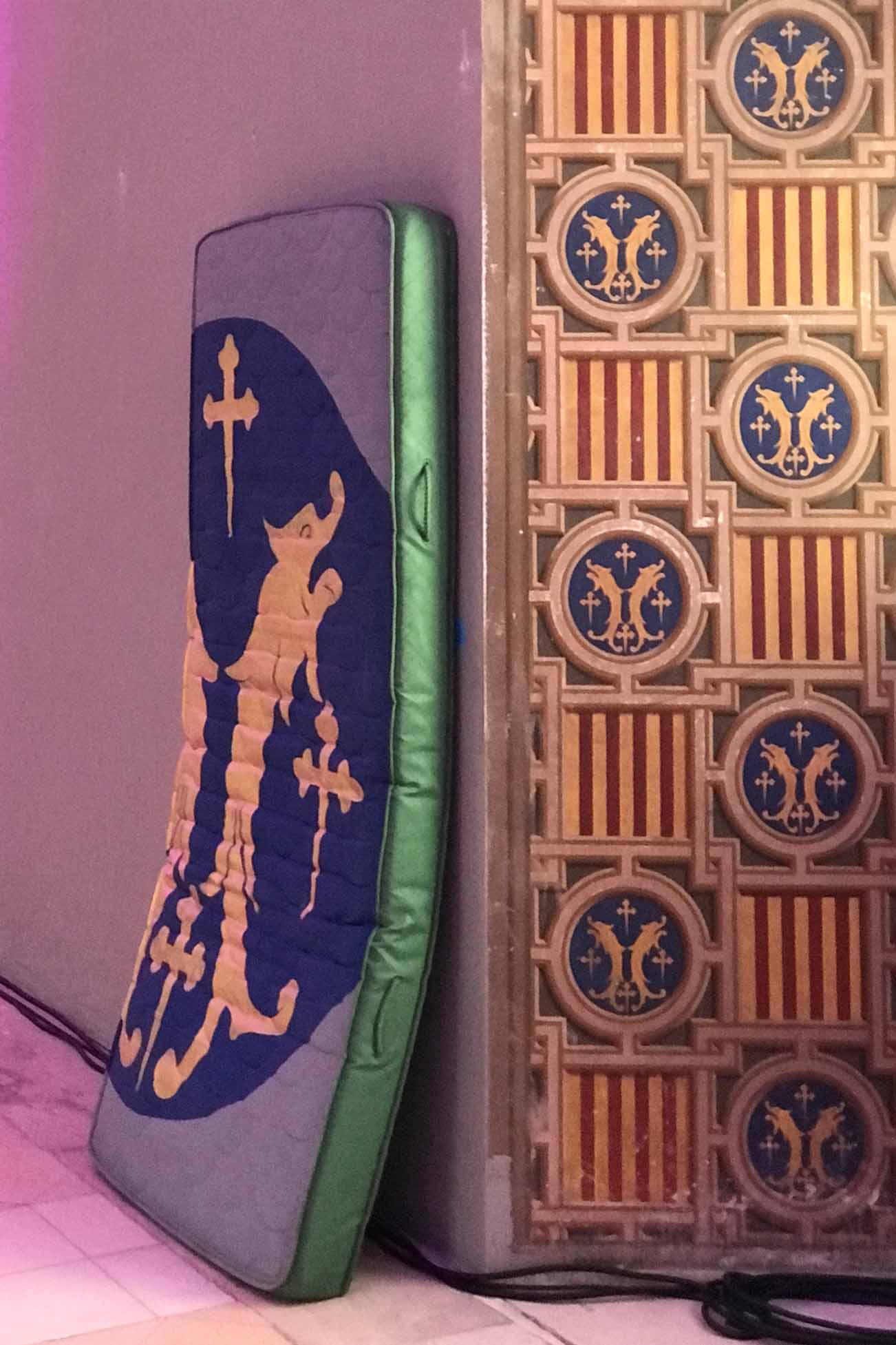 L’artiste marseillais Ipin a préparé en amont des matelas peints avec les motifs de la grande salle du Musée Lorrain, où se déroulait l’événement avant une grande entreprise de travaux. Les frises des ébrasements de fenêtres et les taches des murs étaient répétés sur les matelas que les danseurs utilisaient comme accessoires.