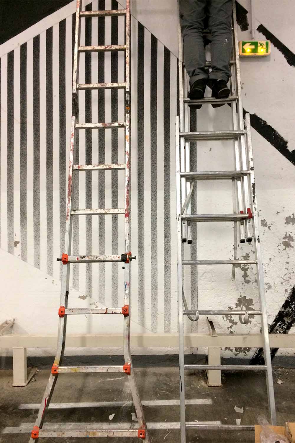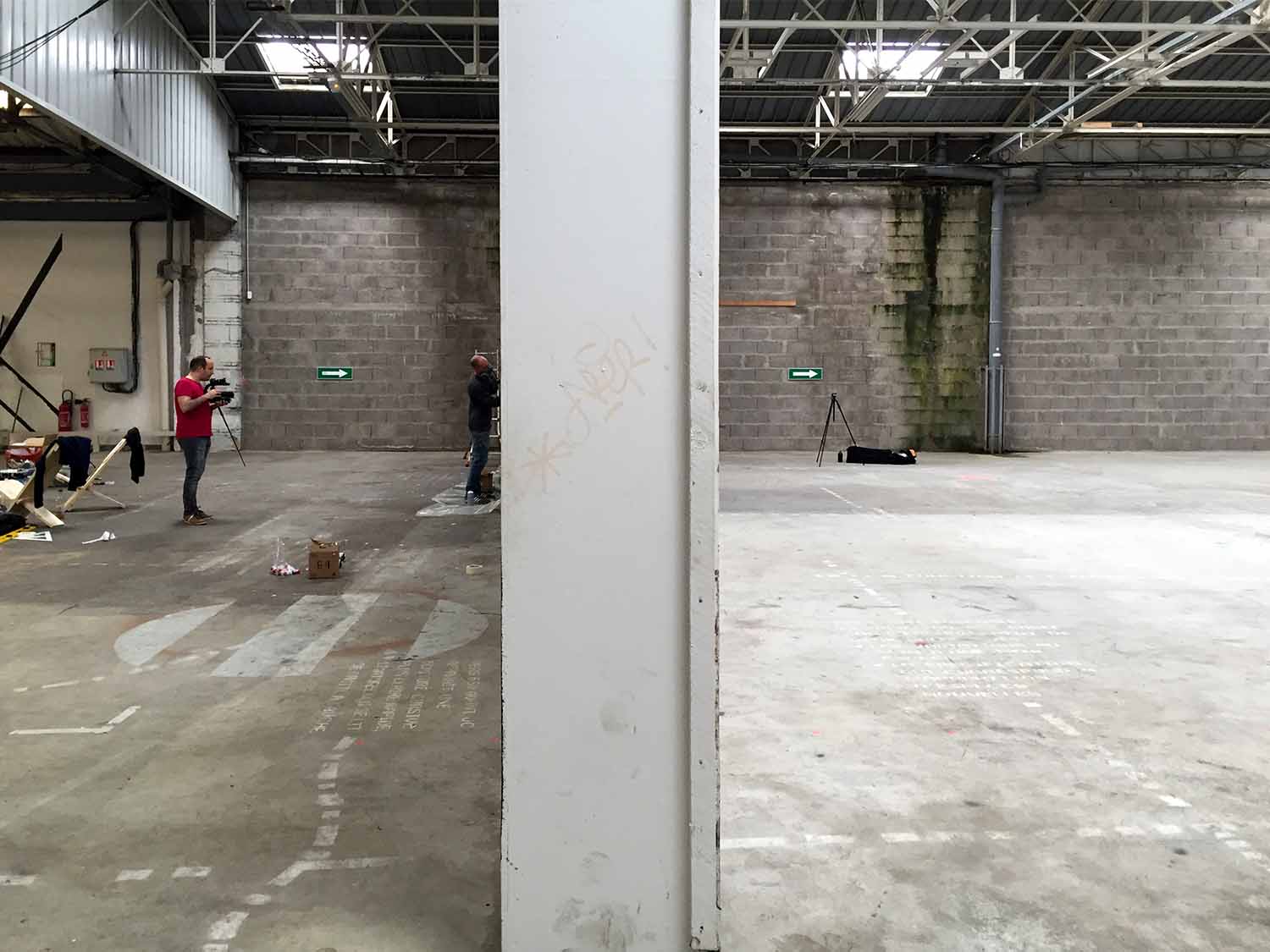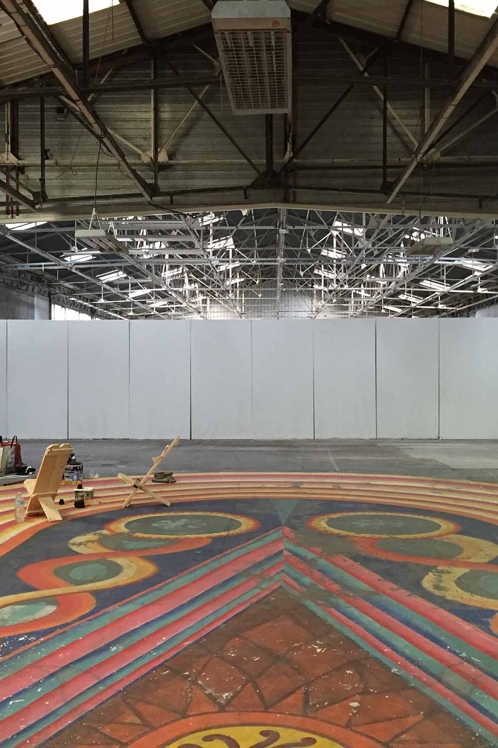 Les dimensions immenses de la salle représentaient un véritable défi ; occuper l’espace dans ce genre de lieu n’est pas facile. Le duo Graphic Surgery – Gilbert1 a donc travaillé en amont sur la scénographie, puis la peinture s’est achevée en live.