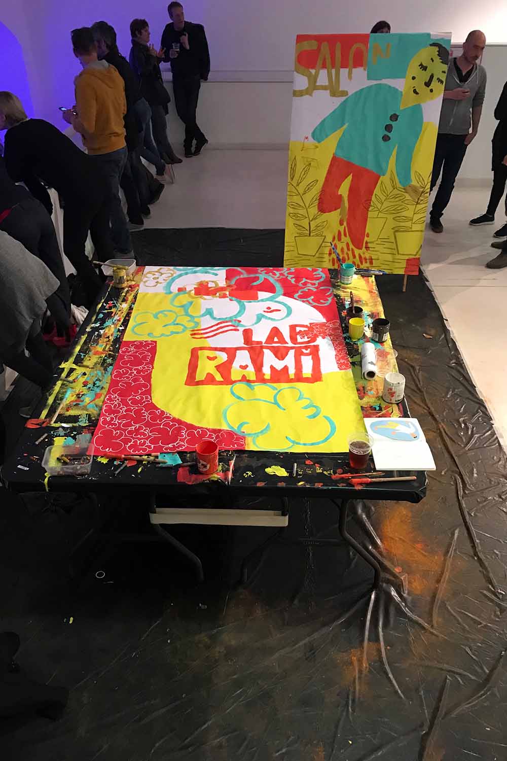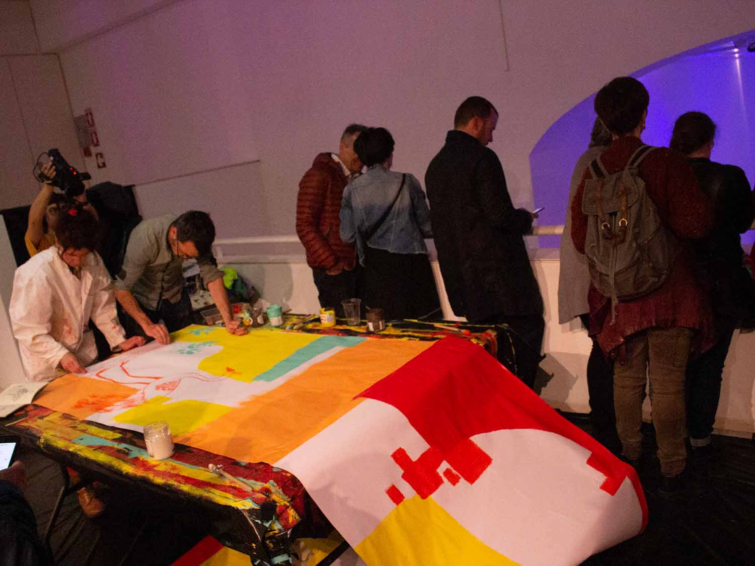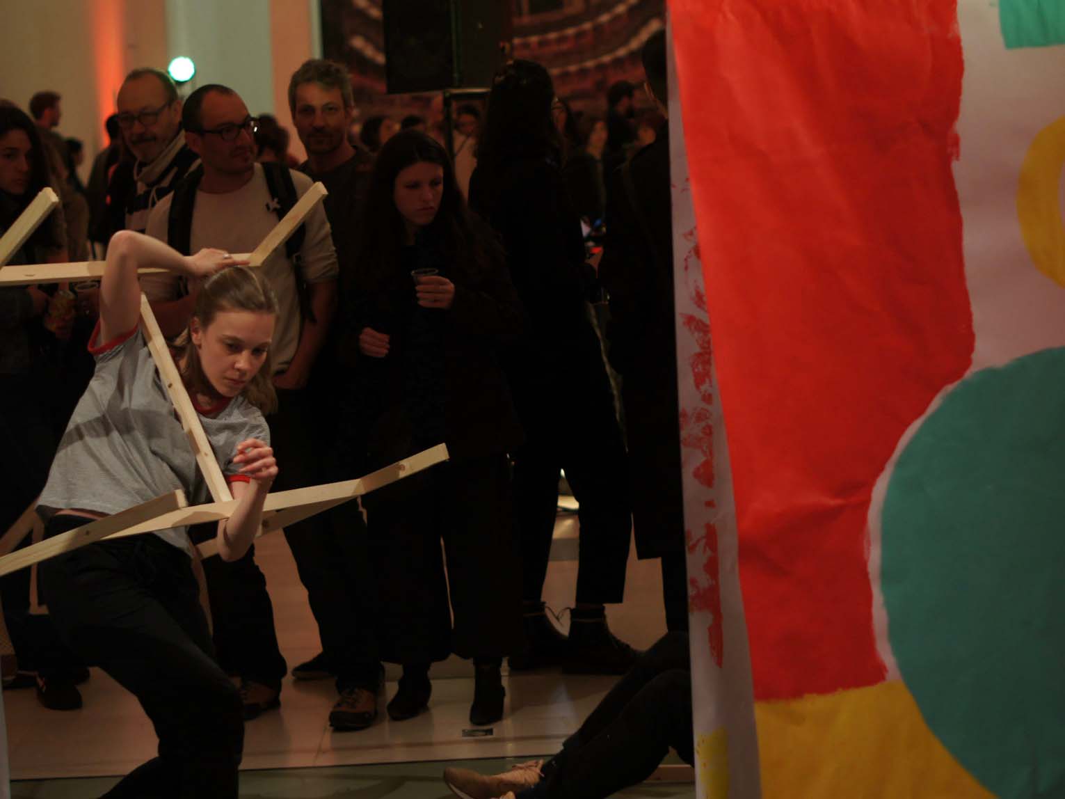 Les artistes nancéiens Monsieur & Madame ont préparé des supports à peindre durant la performance des danseurs et danseuses du CCN – Ballet de Lorraine. Tout le public pouvait participer aux créations, déambuler avec les peintures dans la salle et les donner aux danseurs, ou les utiliser comme scénographie.