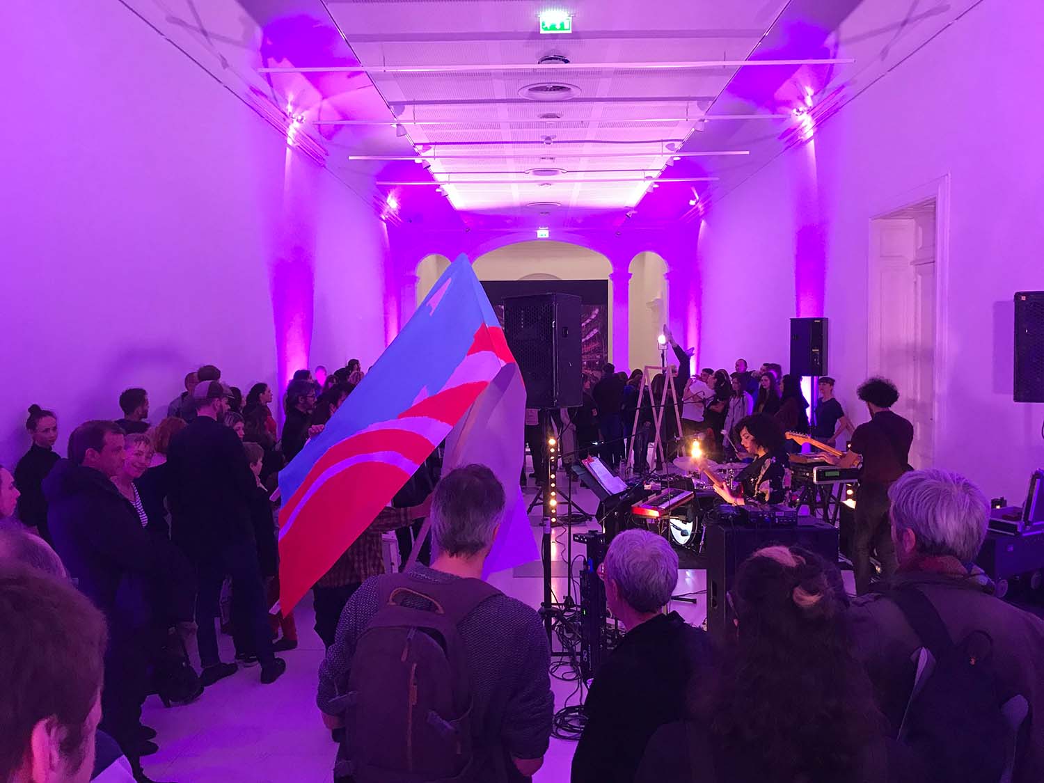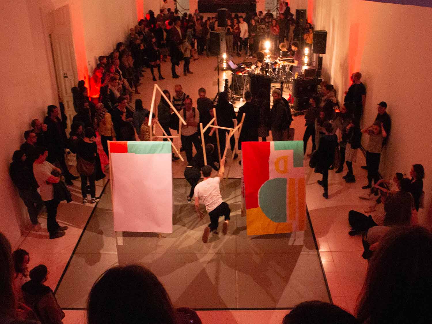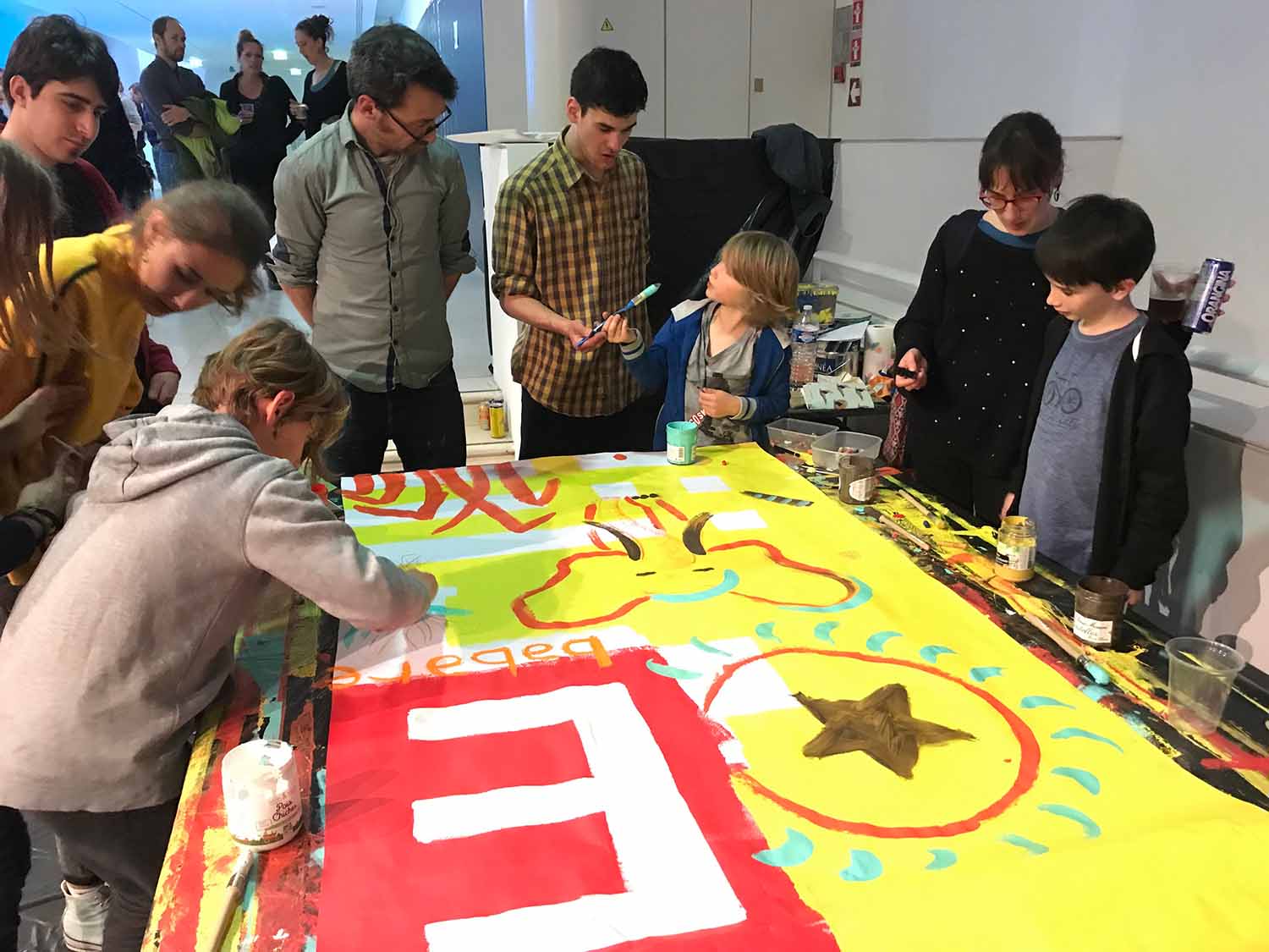 Les artistes nancéiens Monsieur & Madame ont préparé des supports à peindre durant la performance des danseurs et danseuses du CCN – Ballet de Lorraine. Tout le public pouvait participer aux créations, déambuler avec les peintures dans la salle et les donner aux danseurs, ou les utiliser comme scénographie.