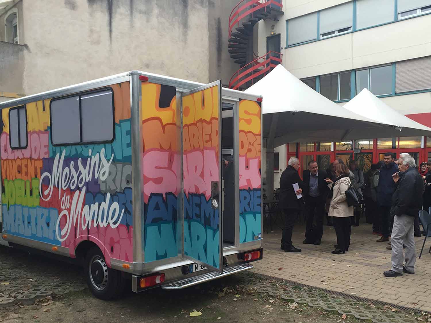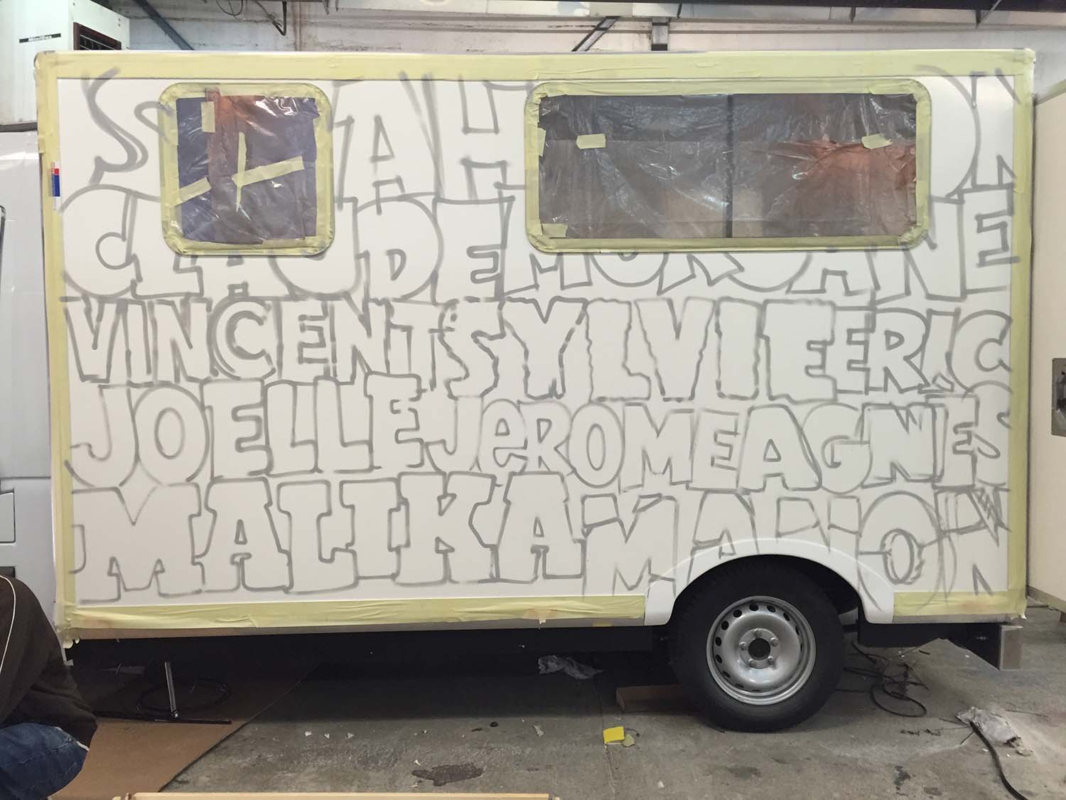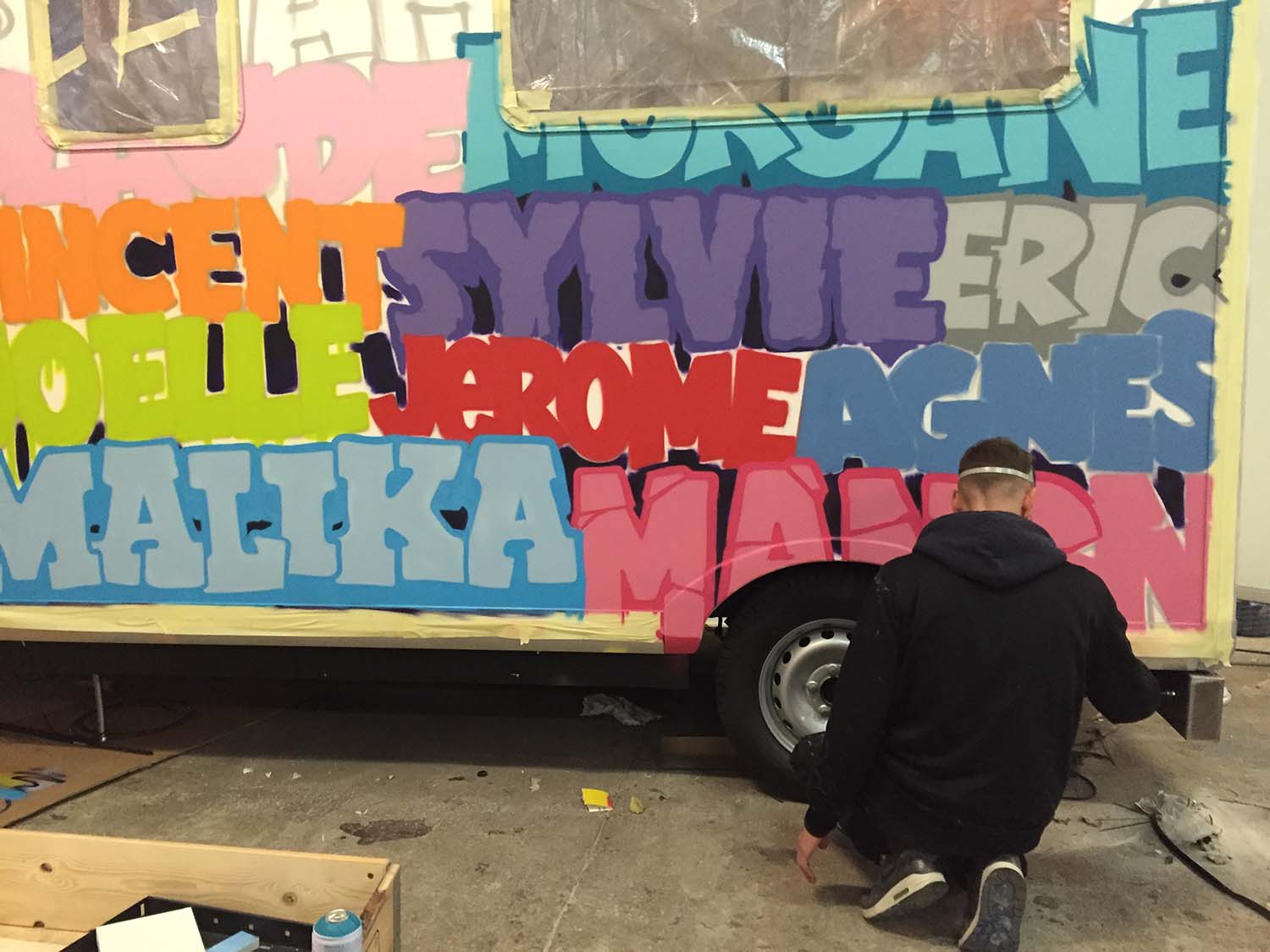 L’association Médecins du Monde a fait appel au MUR nancy pour la personnalisation d’un nouveau camion itinérant. Nous avons fait appel à l’artiste nancéien Peno, grand passionné de lettres, pour réaliser une œuvre à la bombe. Médecins du monde avait mis en place un crowdfunding pour compléter le financement du camion et de ses aménagements intérieurs totalement conçus sur-mesure ; les participants de plus haut niveau s’étaient vus promettre l’inscription de leur prénom sur l’une des faces du camion. Peno, avec l’aide de Medar pour les zones de remplissage, a pris le parti de composer uniquement avec ces prénoms, dans une accumulation de lettres en variations de typographies liées à la culture du graffiti.