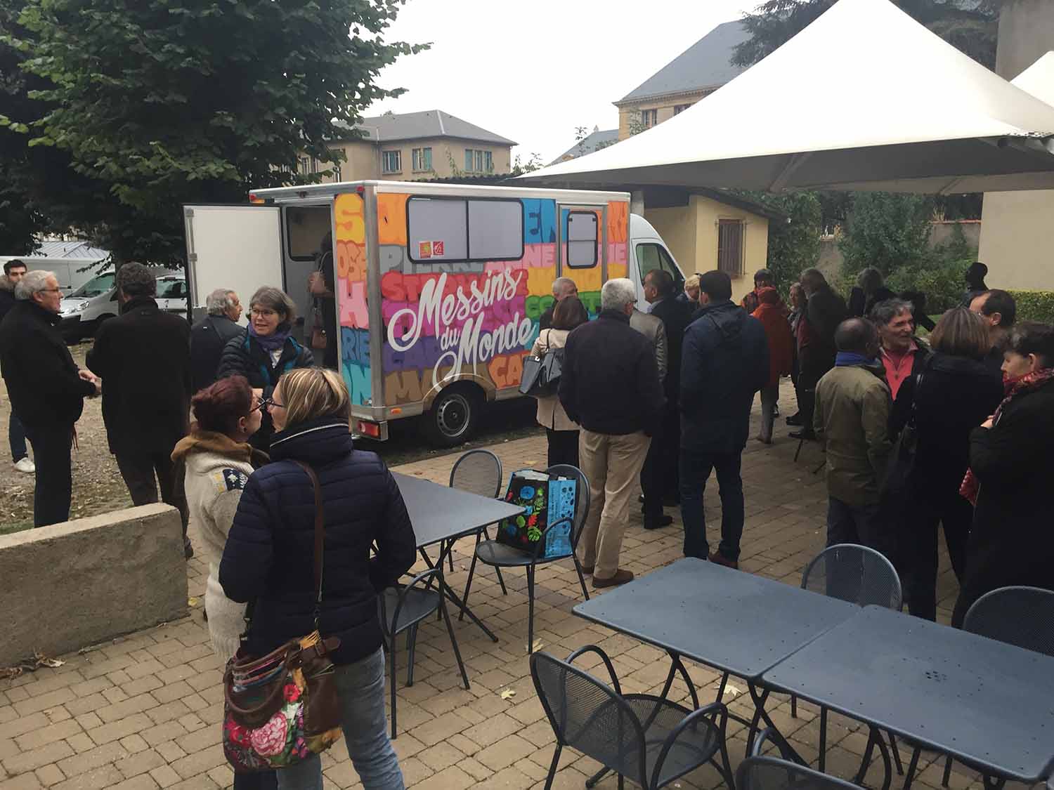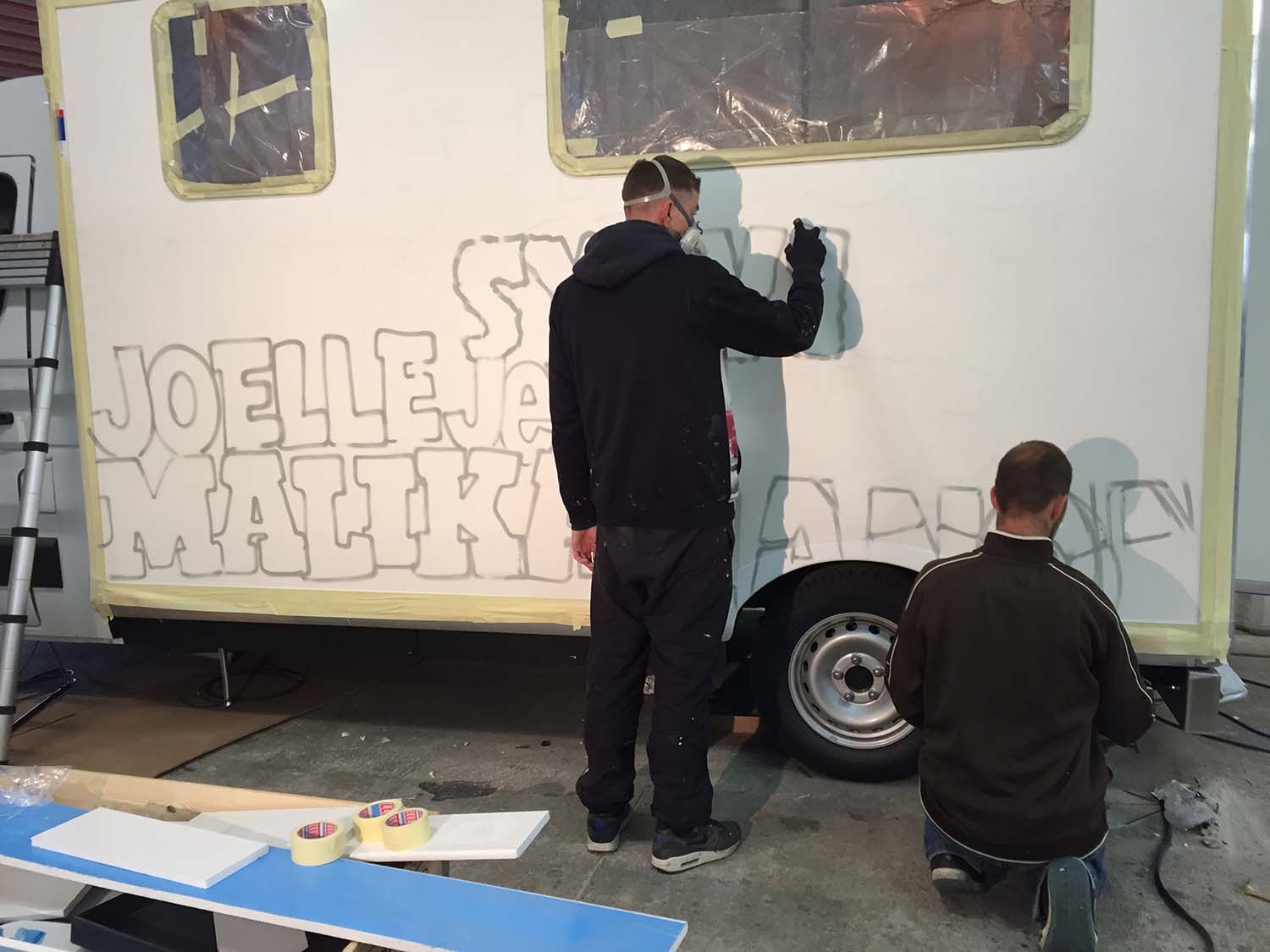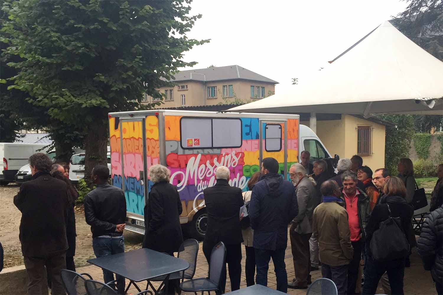 L’association Médecins du Monde a fait appel au MUR nancy pour la personnalisation d’un nouveau camion itinérant. Nous avons fait appel à l’artiste nancéien Peno, grand passionné de lettres, pour réaliser une œuvre à la bombe. Médecins du monde avait mis en place un crowdfunding pour compléter le financement du camion et de ses aménagements intérieurs totalement conçus sur-mesure ; les participants de plus haut niveau s’étaient vus promettre l’inscription de leur prénom sur l’une des faces du camion. Peno, avec l’aide de Medar pour les zones de remplissage, a pris le parti de composer uniquement avec ces prénoms, dans une accumulation de lettres en variations de typographies liées à la culture du graffiti.