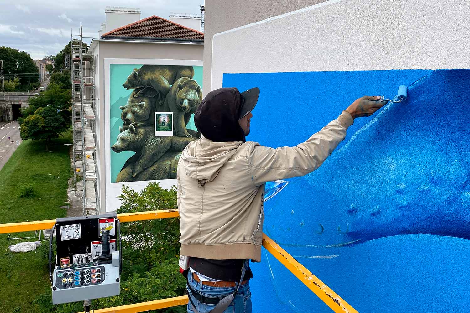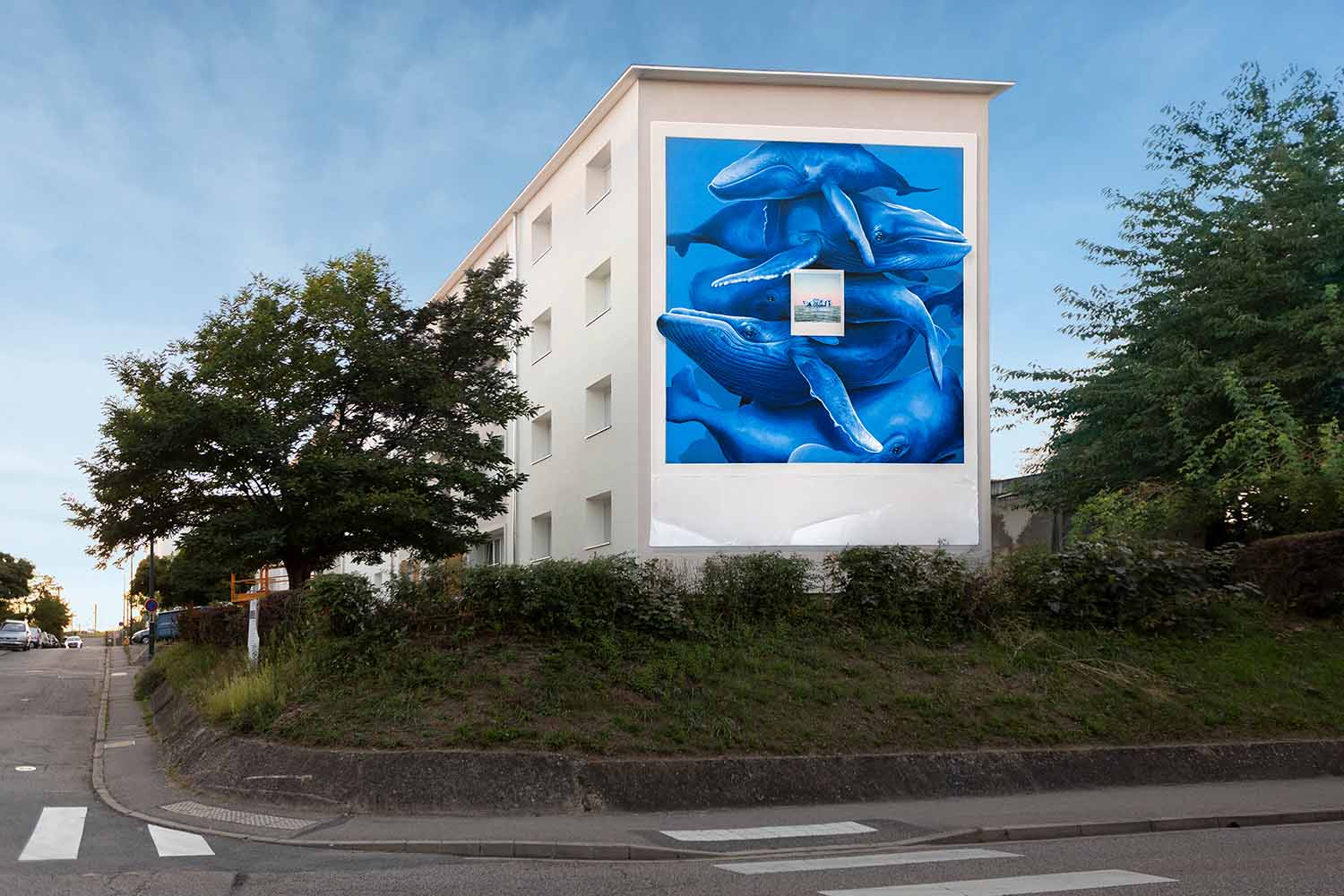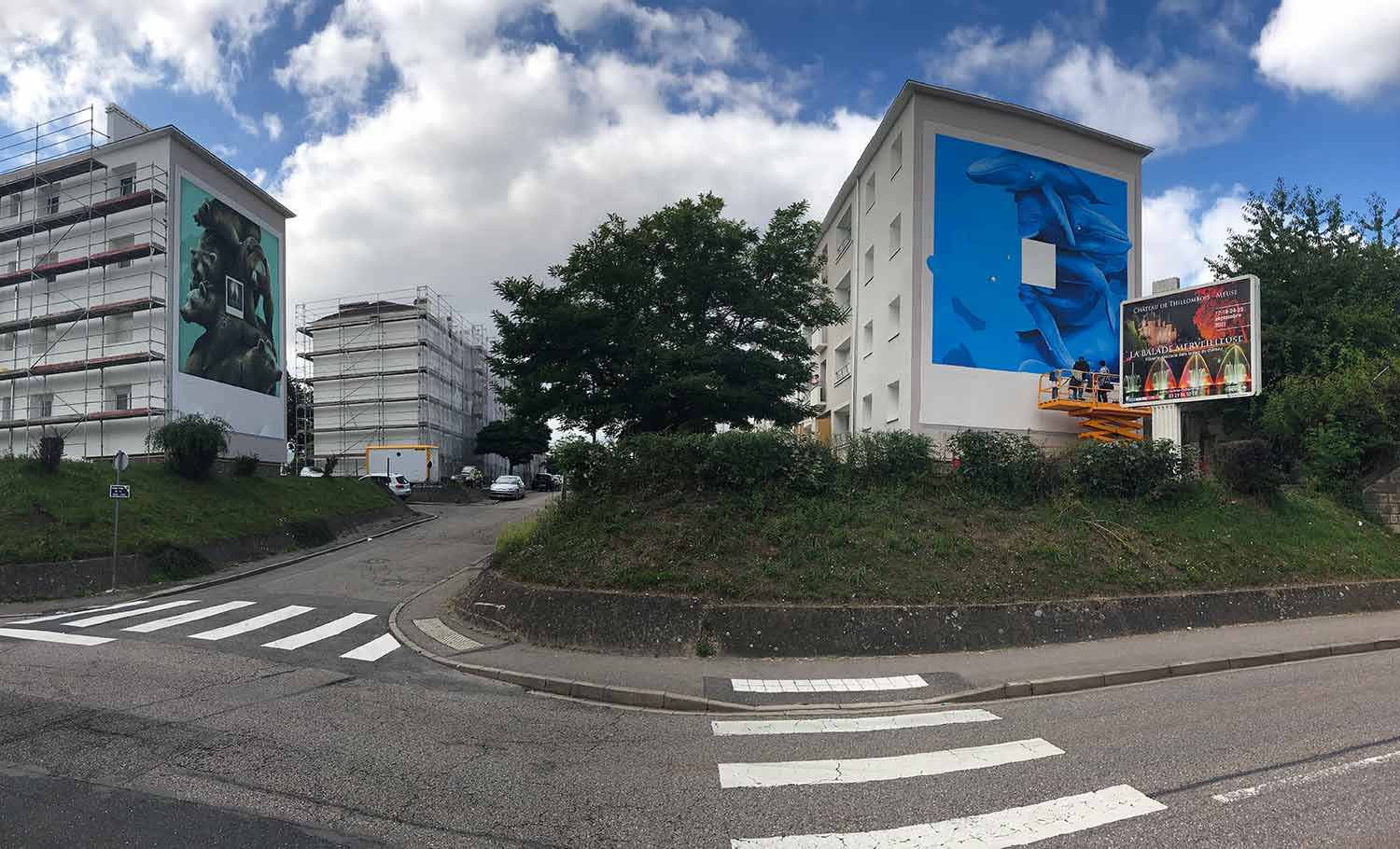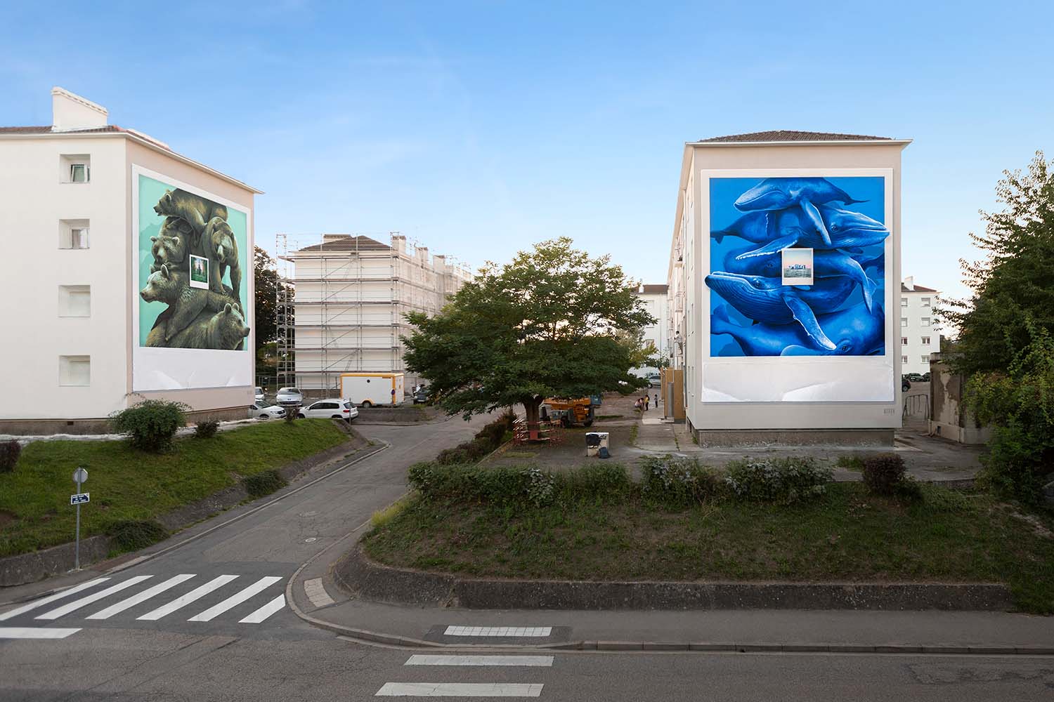 La commune de Jarville-la-Malgrange nous confiant deux façades pour un même projet dans un quartier en travaux, nous avons saisi l’occasion pour inviter le duo d’artistes suisses Nevercrew. Dans leur style unique, ils ont eu l’intention de faire passer, comme à leur habitude, un message de sensibilisation au sujet de l’environnement. Une nouvelle intervention sur notre mur quelques mois plus tard fait suite à cette double fresque nommée Bracketing.