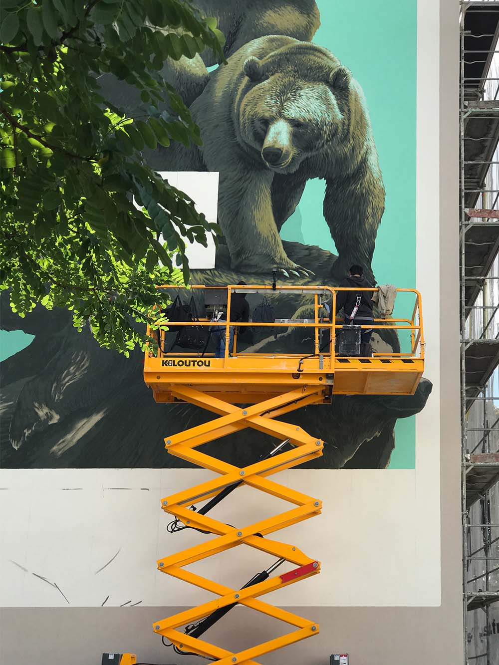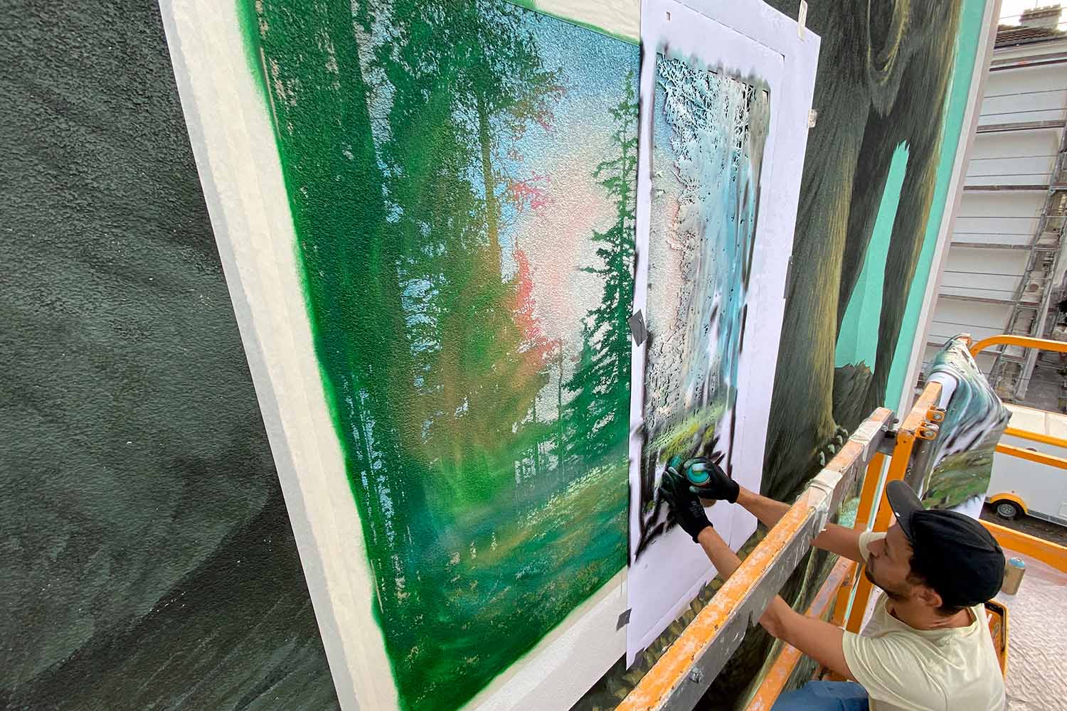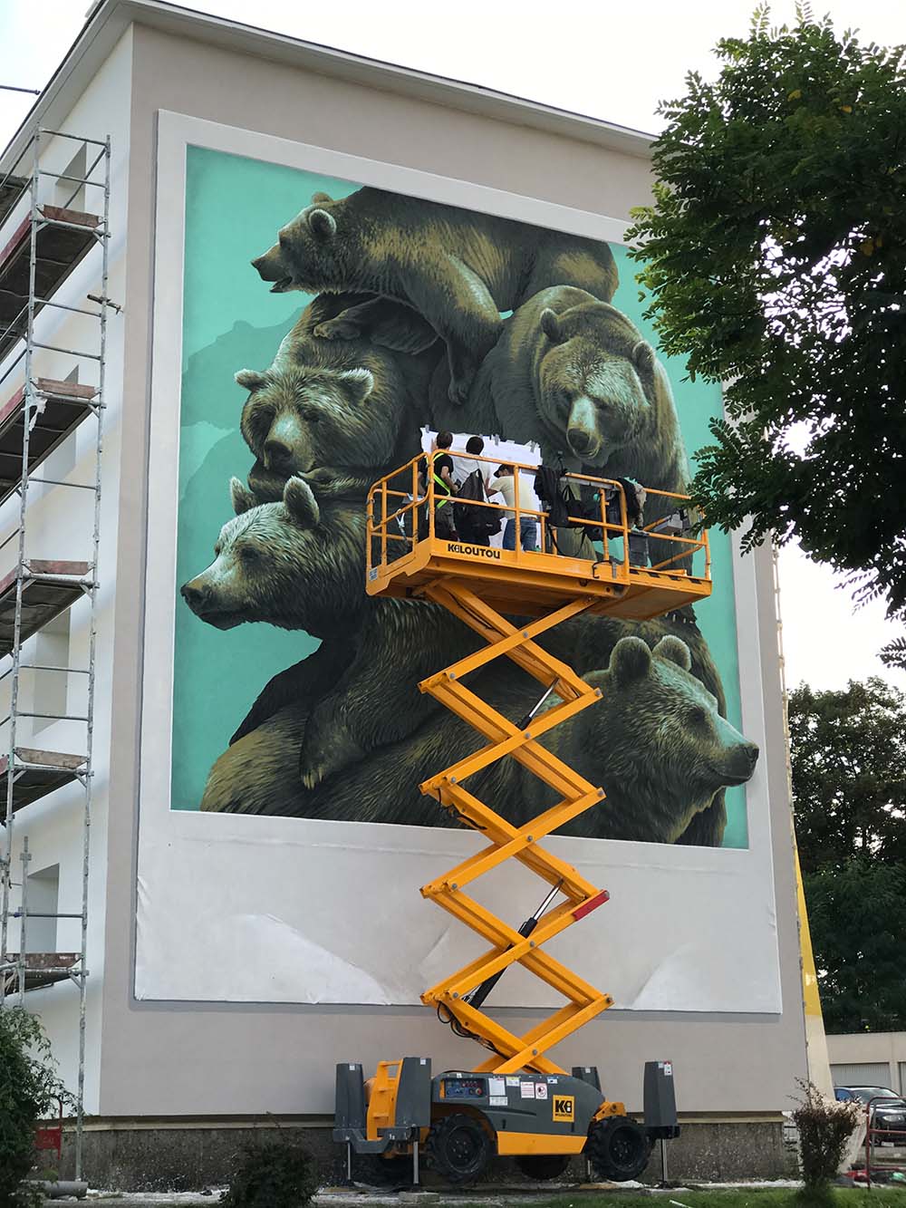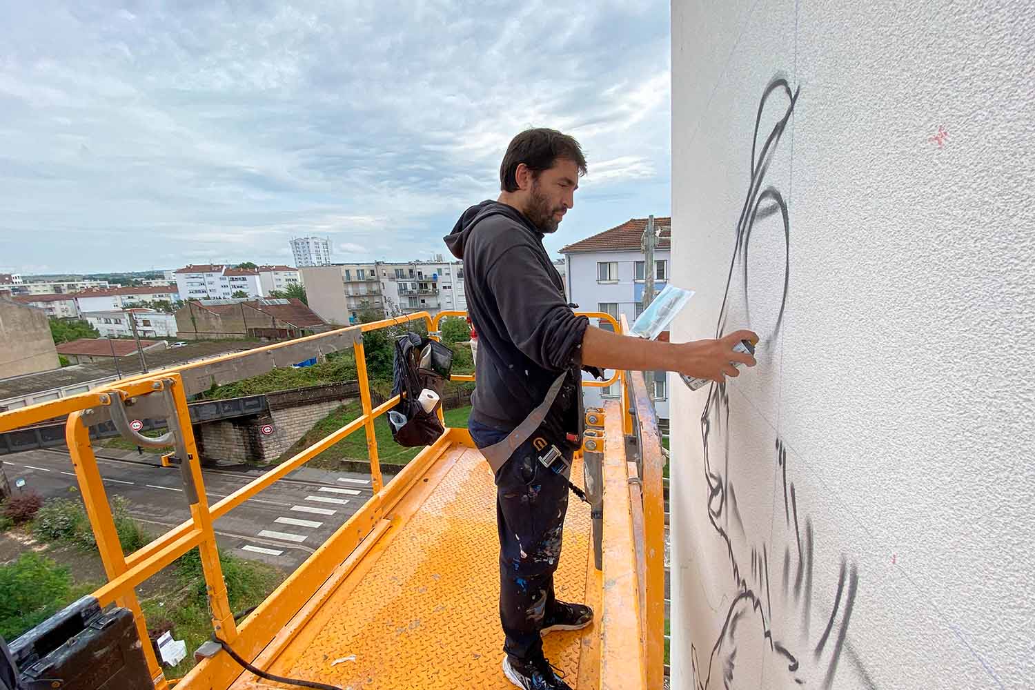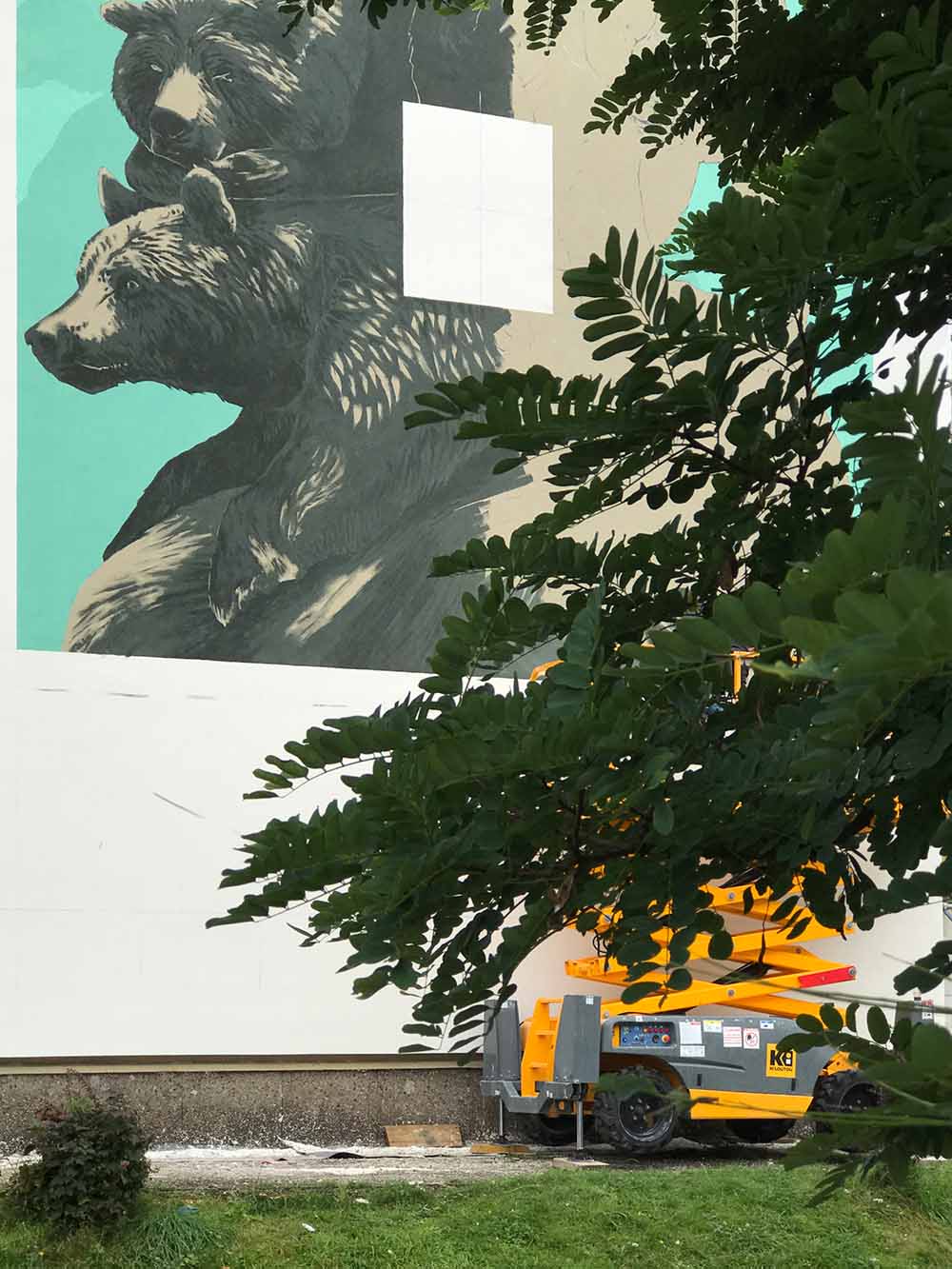 La commune de Jarville-la-Malgrange nous confiant deux façades pour un même projet dans un quartier en travaux, nous avons saisi l’occasion pour inviter le duo d’artistes suisses Nevercrew. Dans leur style unique, ils ont eu l’intention de faire passer, comme à leur habitude, un message de sensibilisation au sujet de l’environnement. Une nouvelle intervention sur notre mur quelques mois plus tard fait suite à cette double fresque nommée Bracketing.
